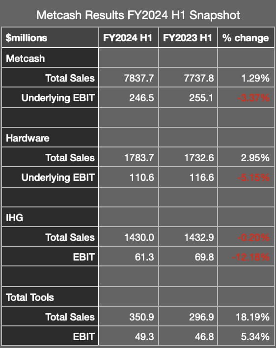 Metcash/IHG/Total Tools FY2025 H1 results