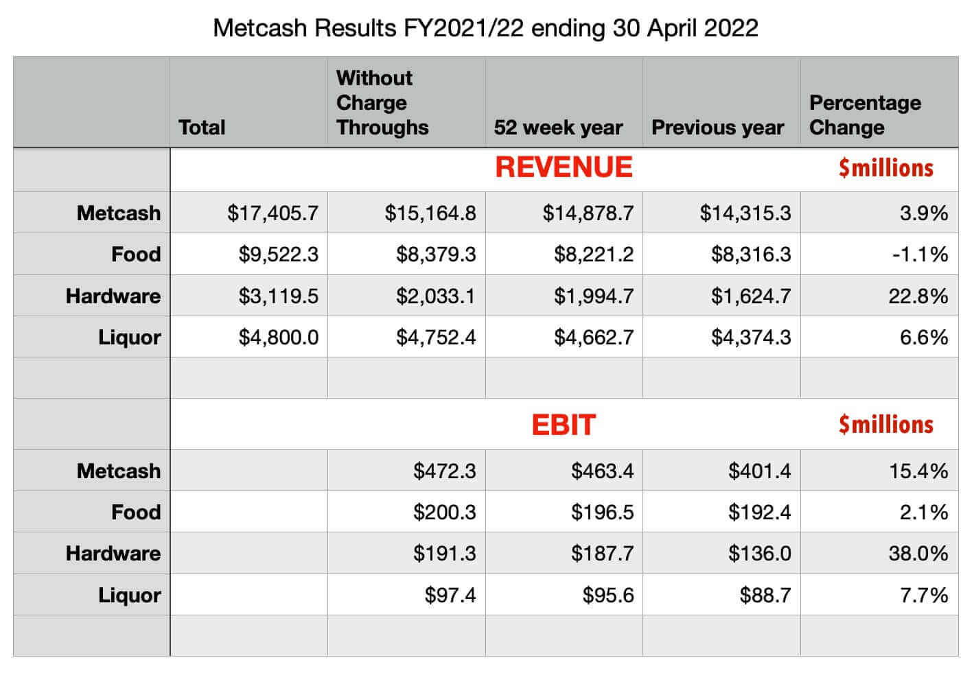Growth in earnings before interest and taxation (EBIT) was essentially flat compared to the pcp, at $262.9 million for the hardware, food and liquor divisions, and $246.1 million when corporate costs are included. Net profit after tax (NPAT), was also flat on the pcp, at $141.3 million.